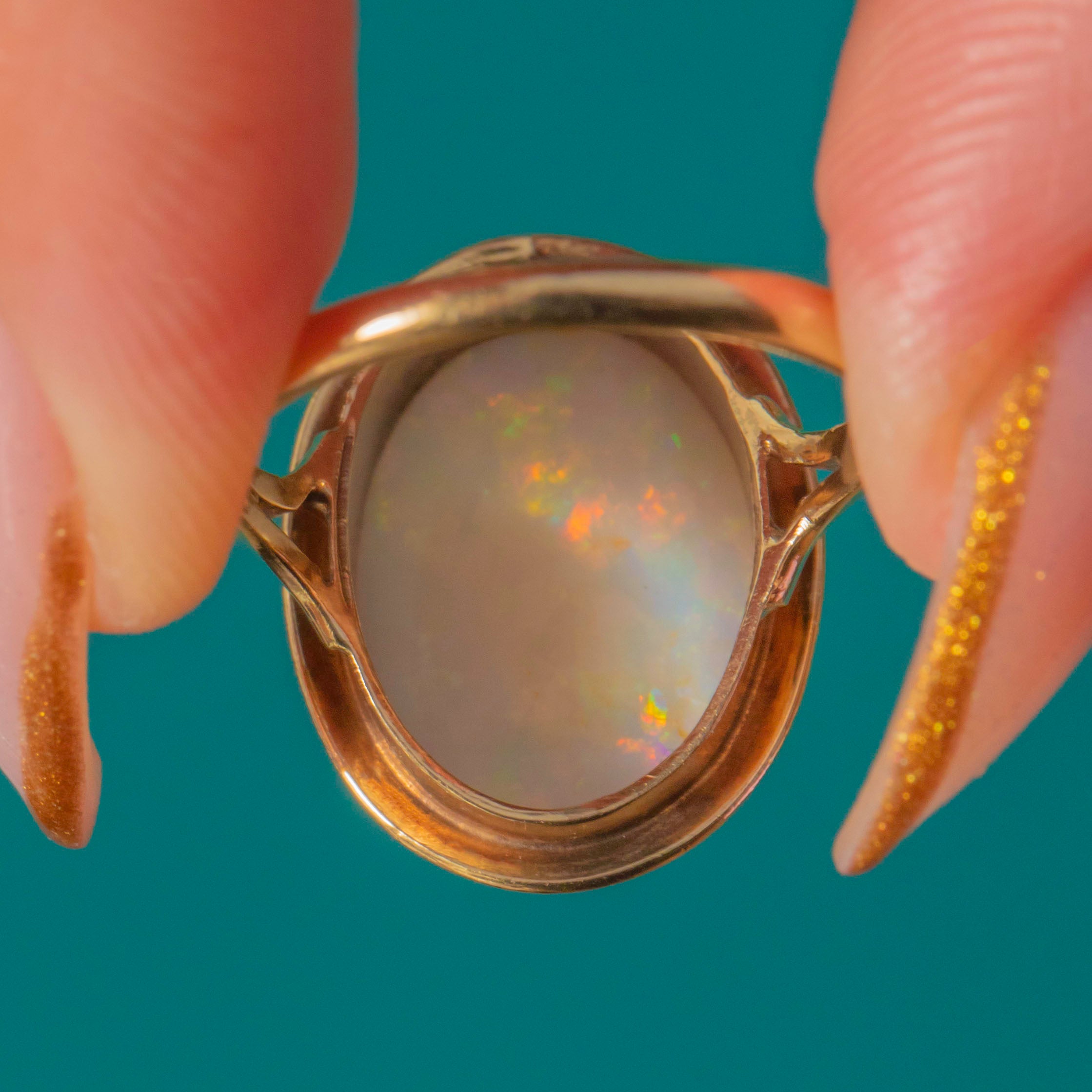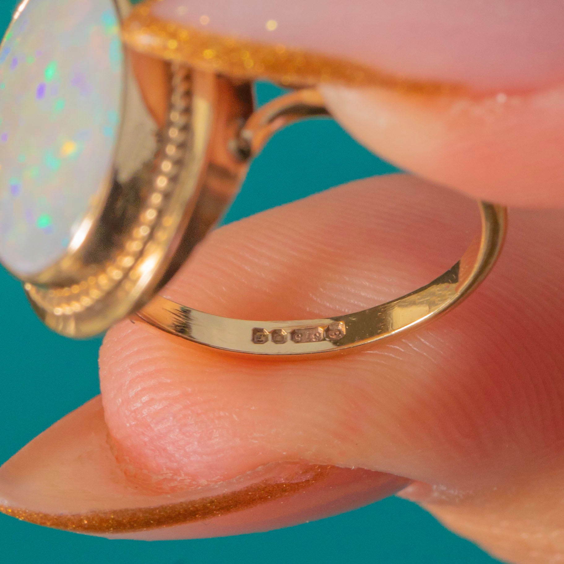 EXCELLENT: The Opal is natural, solid and displays vivid colour play across the surface with no cracks or abrasions visible. The 9ct Gold setting and band are robust and smooth, with clear, crisp English hallmarks dating the ring precisely to 1980.