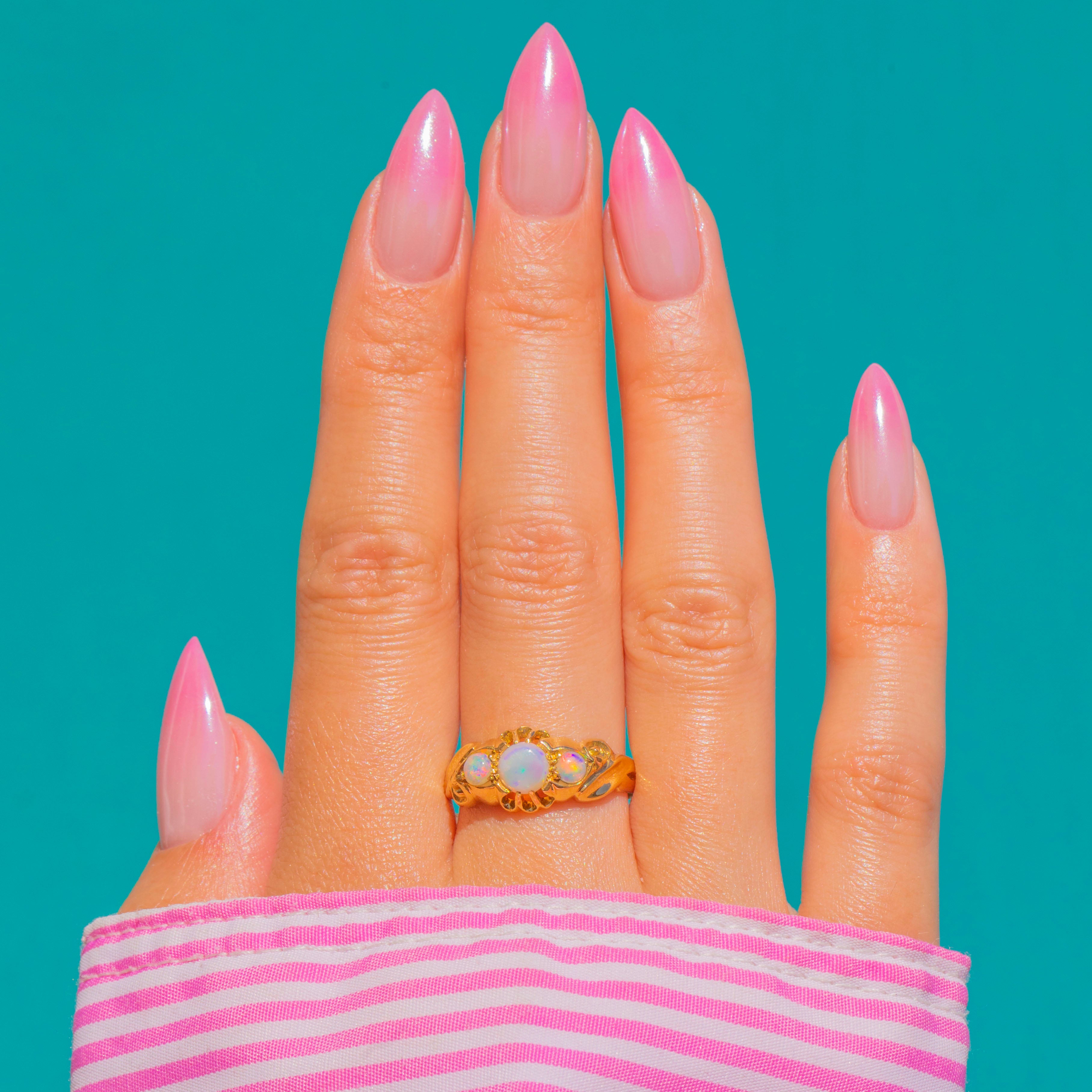 A luminous Edwardian three-stone Opal ring in rich 18ct Gold, hallmarked for Chester 1909. A larger domed Opal takes centre stage, flanked by two smaller cabochons that dance with vivid play-of-colour in blues, greens, pinks and warm ember flashes. Each Opal is cradled in scalloped settings above a delicately pierced under-gallery for a light, lacy presence on the finger.